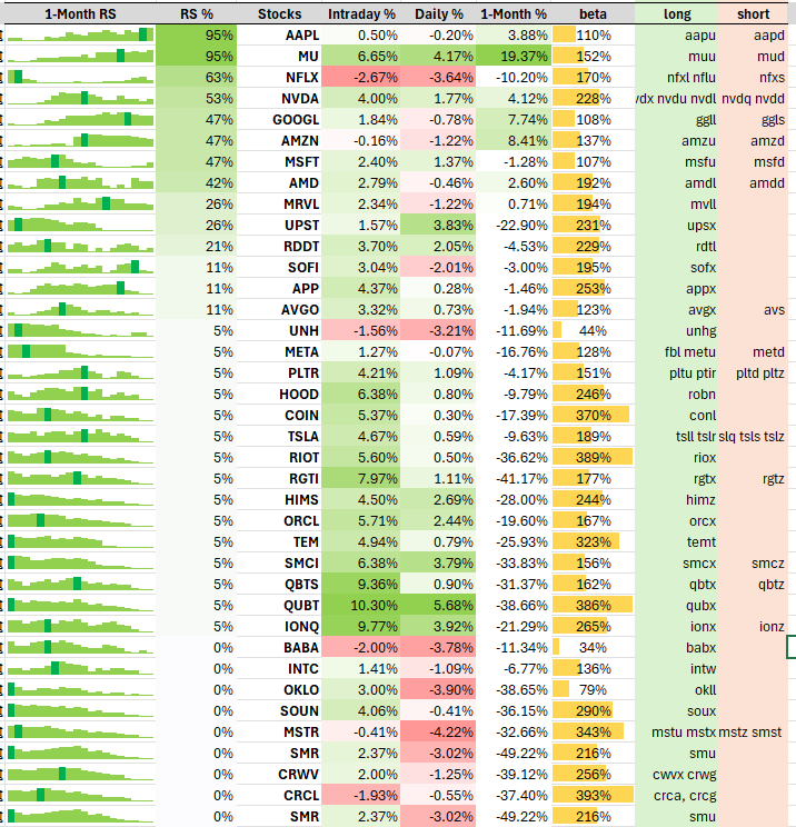 This is my updated 38-name Liquid Mega list (1-Month RS Sorted), including leveraged long, inverse short, and leveraged inverse short ETFs. My daily focus list, pulled from this set, is available exclusively to subscribers.