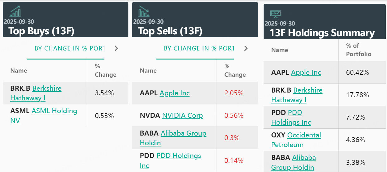 The most significant move this quarter was the substantial increase in his holdings of $Berkshire Hathaway(BRK.B)$ . In the third quarter, Duan Yongping significantly increased his Berkshire Hathaway holdings by 1.81 million shares, an increase of 53.53%. Duan Yongping has repeatedly expressed his optimism about Buffett and Berkshire Hathaway: "The people Buffett chooses are never bad; their culture won't change. They're not a speculative company. Holding Berkshire Hathaway is definitely better than randomly buying a mutual fund."