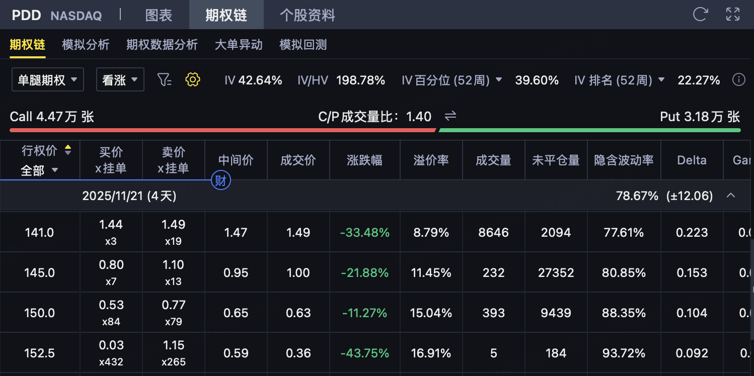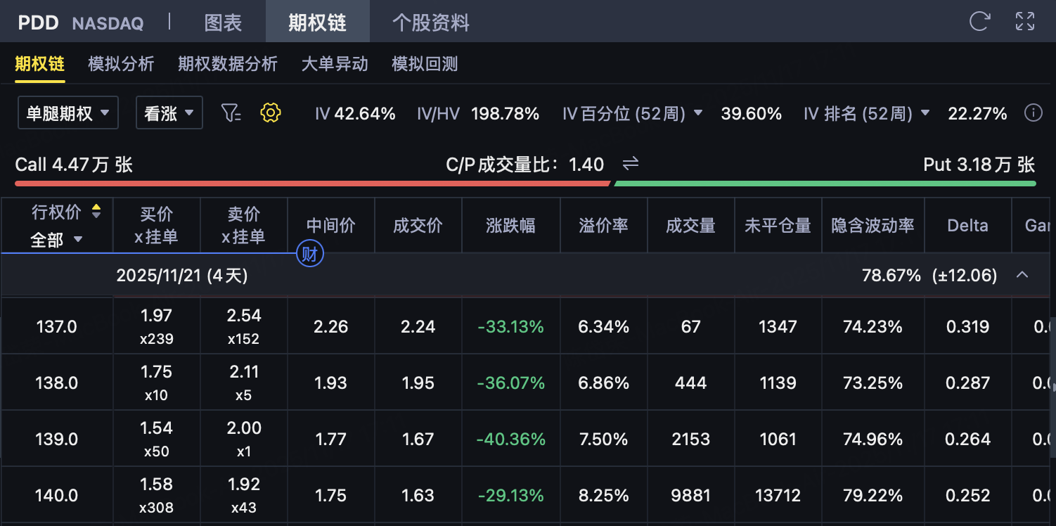 Investors limit potential losses by selling lower strike price Call and buying higher strike price Call while capturing net premium income. The strategy is inPinduoduo stock holds at or below $137When obtaining maximum benefits, it belongs toBearish bias, limited gains, limited risksCombination strategy.