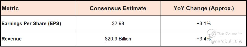 Consensus Estimates: Analysts anticipate EPS of $2.98 (a roughly +3.1% YoY increase) on Revenue of $20.9$ Billion (a roughly +3.4% YoY increase).