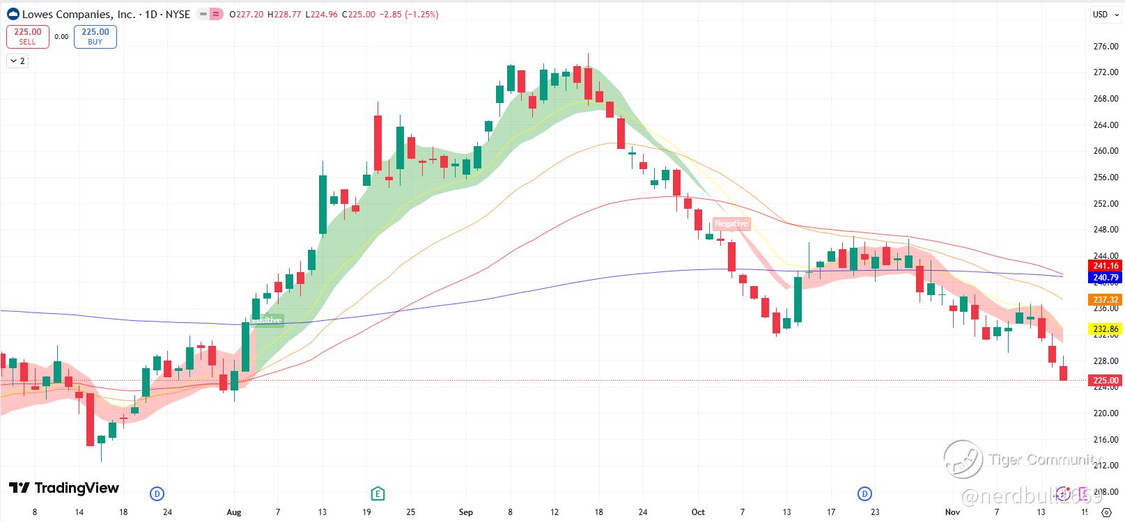 Consumer sentiment on LOW product and services might be a key whether consumer spending would return to a good level, as LOW is trading in a downward trend with a negative RSI momentum.