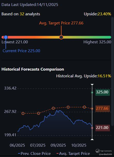 Based on 32 analysts from Tiger Brokers offering 12 month price targets for Lowe's in the last 3 months. The average price target is $277.66 with a high forecast of $325.00 and a low forecast of $221.00. The average price target represents a 23.40% change from the last price of $225.00.