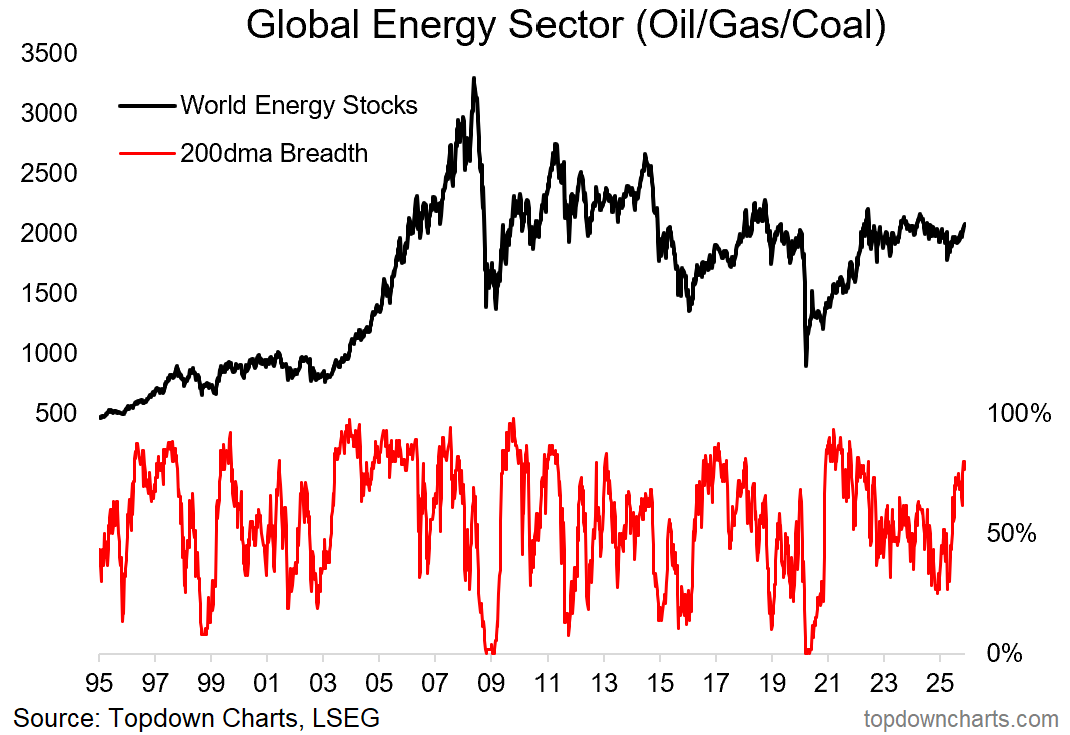 And if you look at global energy stocks there is some very interesting price action underway indeed. The world energy stock index is turning up with strengthening breadth — and is set to challenge the upper end of that multi-year trading range.