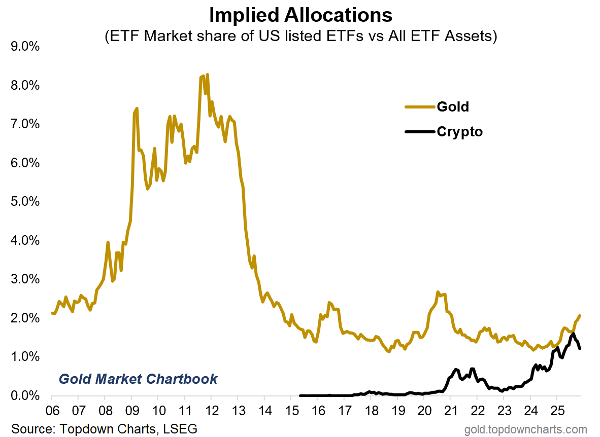 Just as allocations to gold ETFs are starting to move higher, allocations to crypto (Bitcoin & Ethereum) have peaked and rolled over.