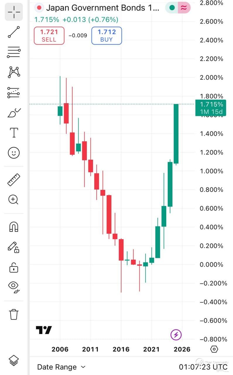 The 10-year JGB yield closed at 1.721% today โ the highest since September 2008. That single number just killed the greatest free-money trade in history.