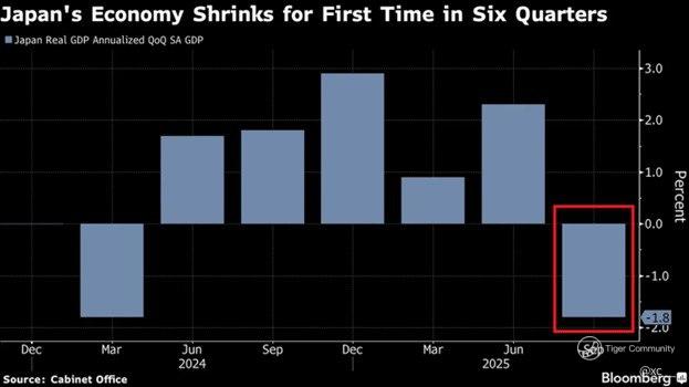 Then the GDP print dropped like a guillotine: โ1.8% annualized in Q3, the first contraction in six quarters, smashing the +2.3% from Q2 into oblivion. Private residential investment collapsed, exports cratered, capex plans shelved. The last pillar just cracked.