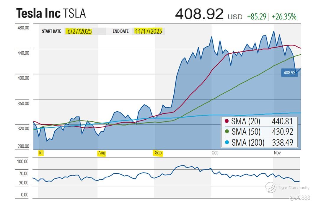 Just a day earlier (on Thu, 13 Nov 2025), TSLA plunged -6.6% to $401.99, breaking decisively below its 50-day moving average and undercutting the lows of a recent base.