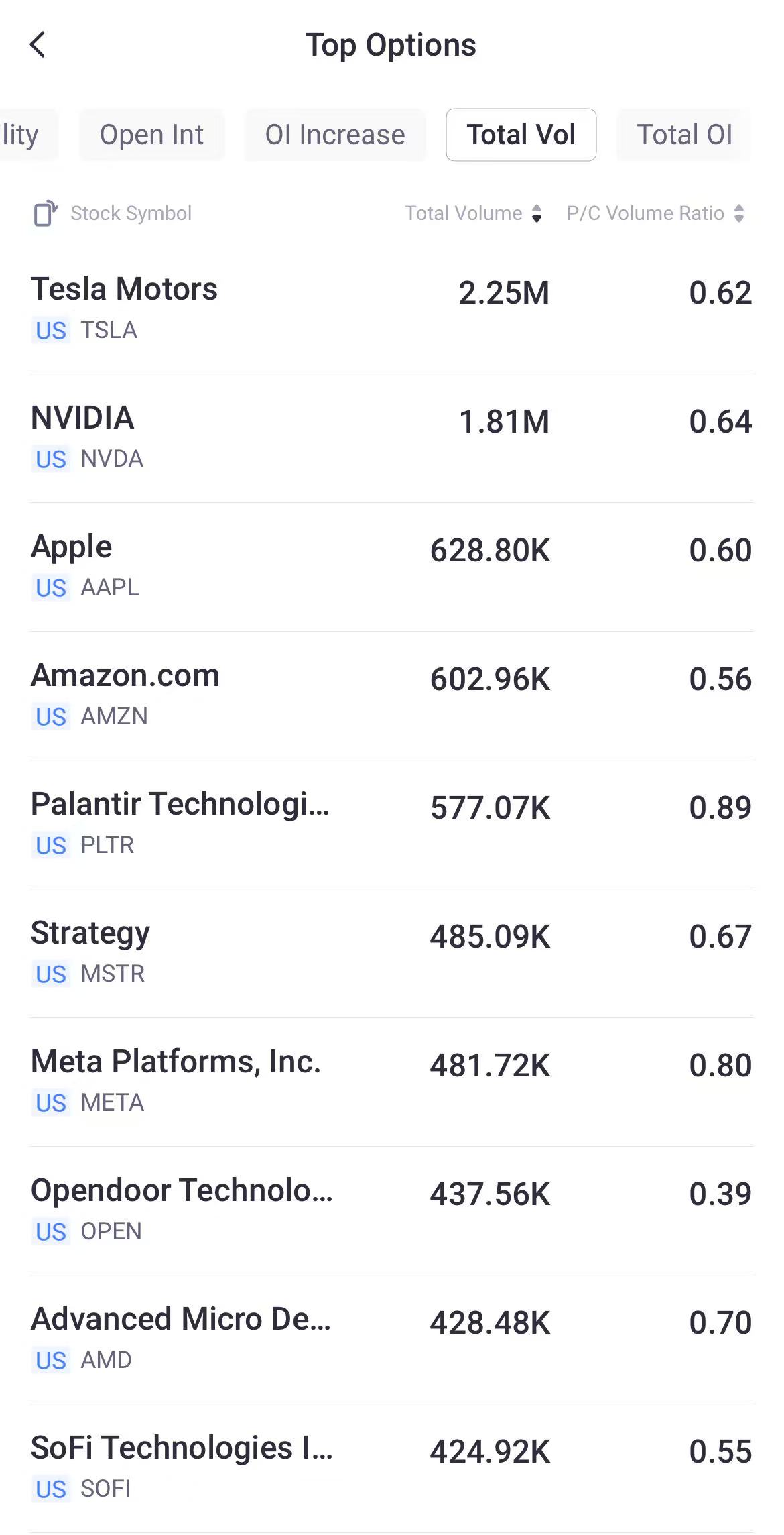 Top 10 Option Volumes