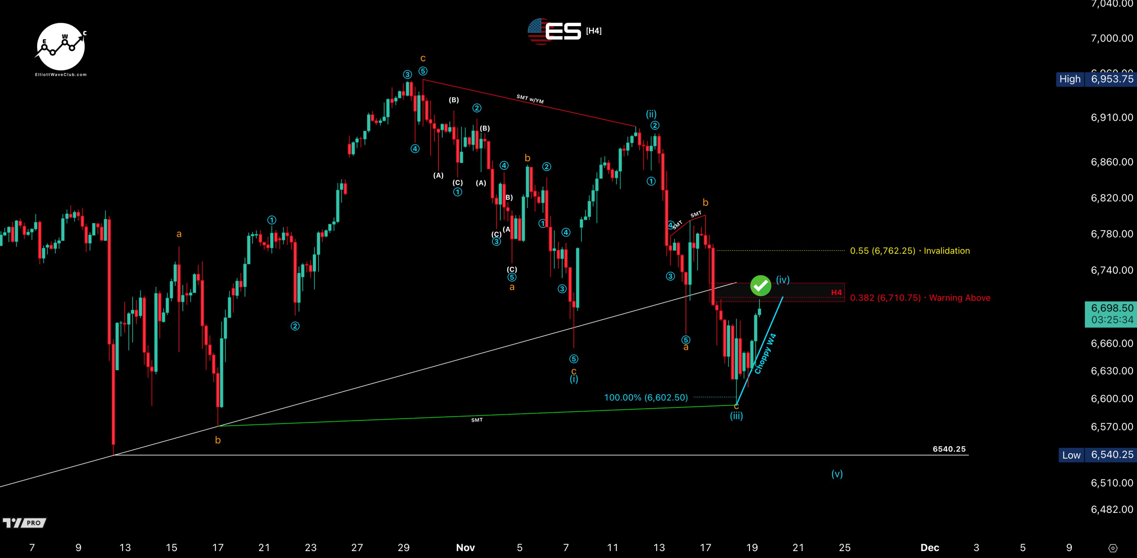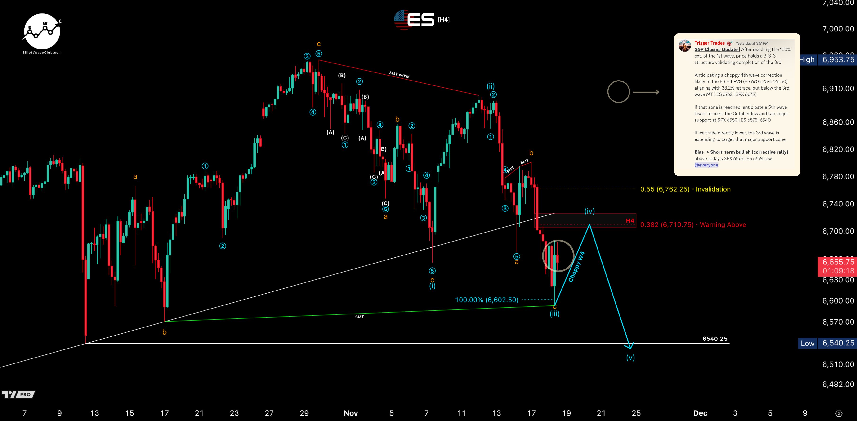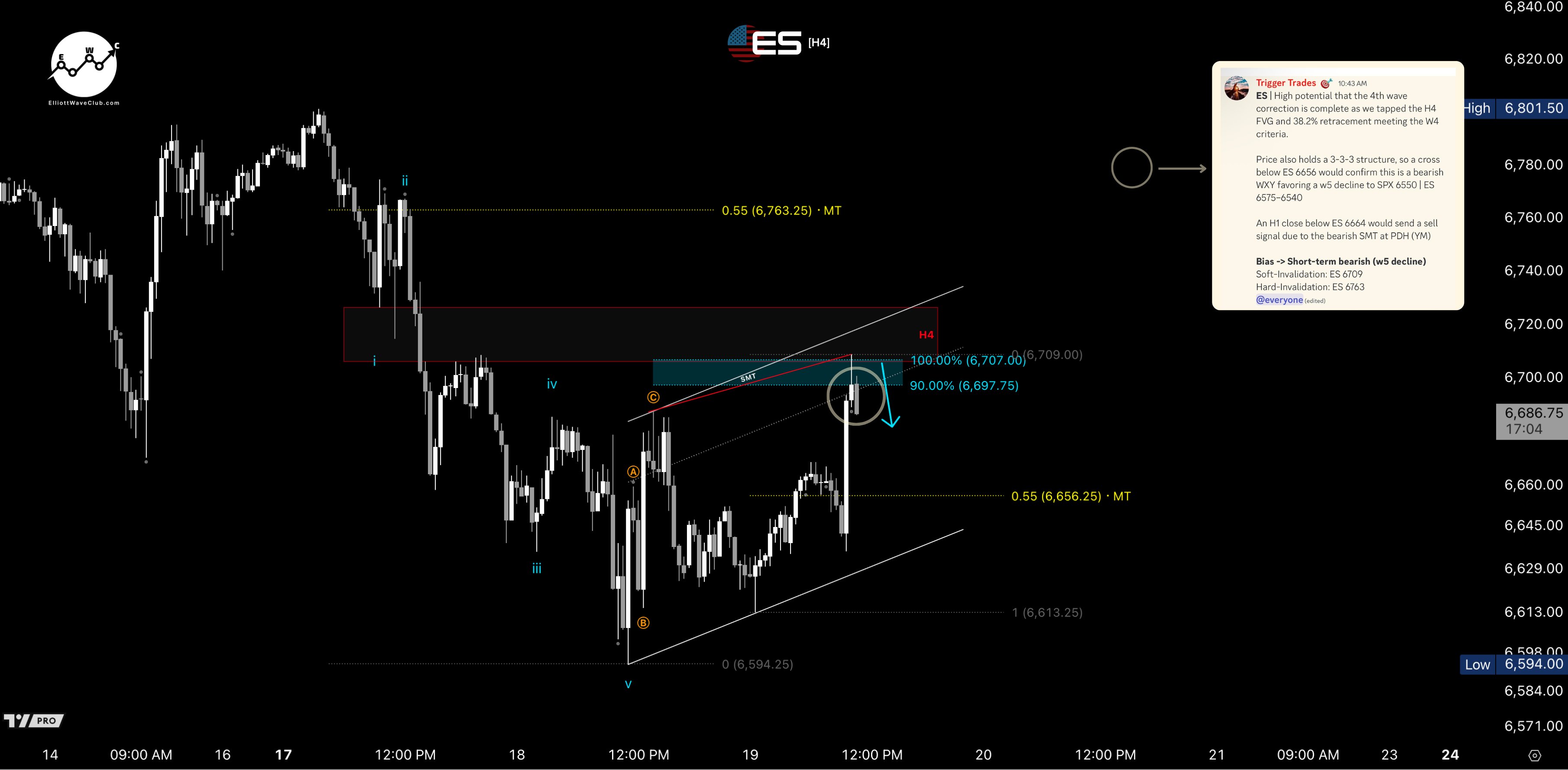 Members were told ahead of time that price would form a corrective rally — and specifically a choppy one — targeting the $E-mini S&P 500 - main 2512(ESmain)$ 6710 zone 🎯