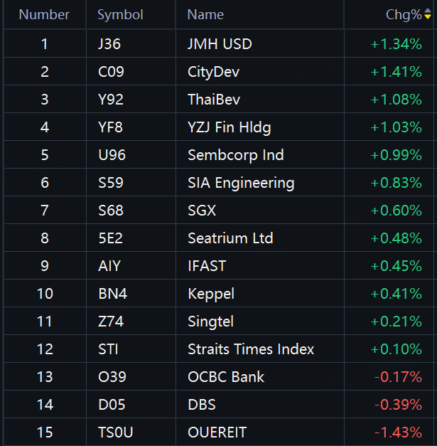 Singapore stocks opened higher on Monday. STI rose 0.1%; JMH USD, CityDev, ThaiBev, YZJ Fin Hldg, Sembcorp up over 1%; SIA Engineering, SGX, Seatrium up within 1%.