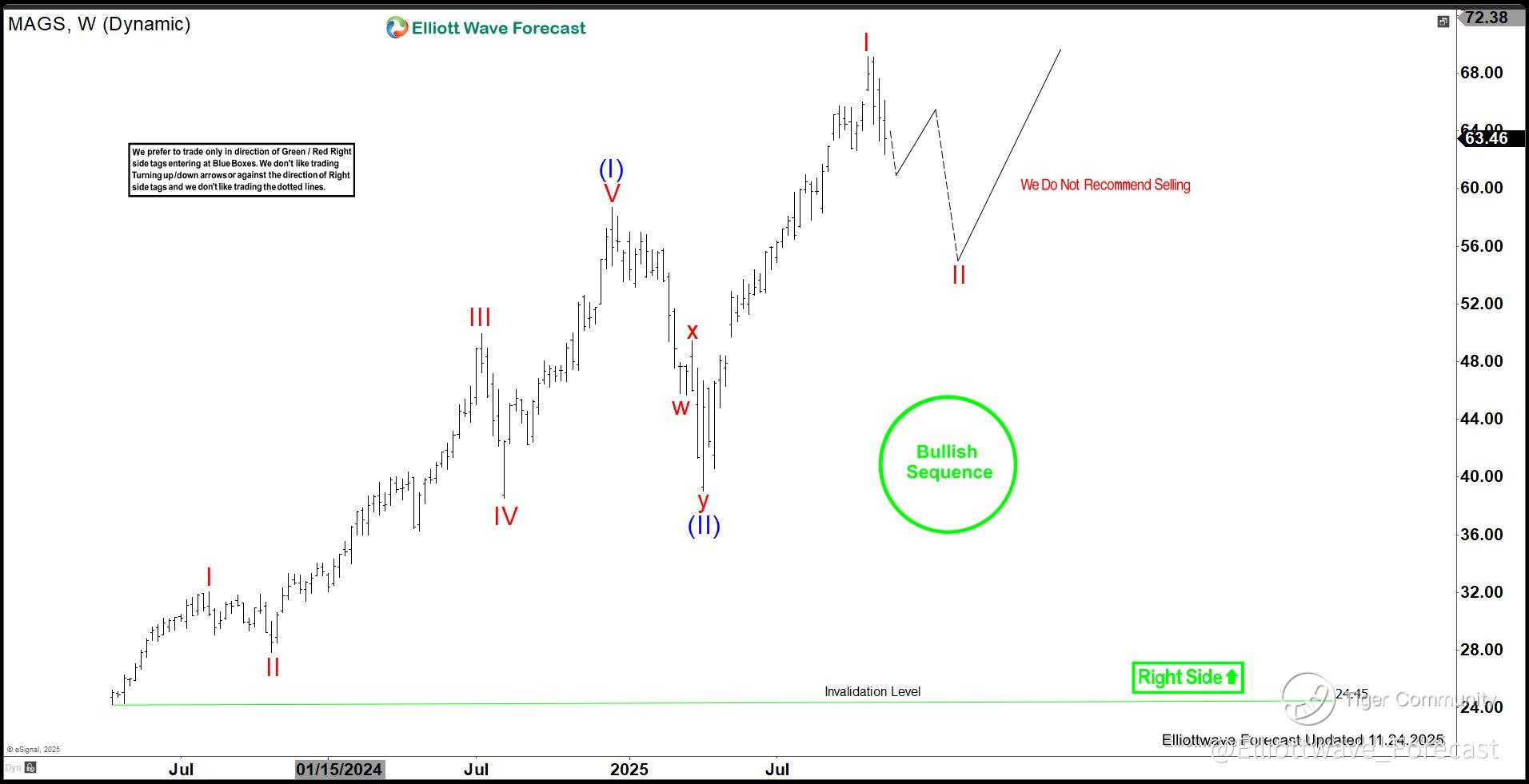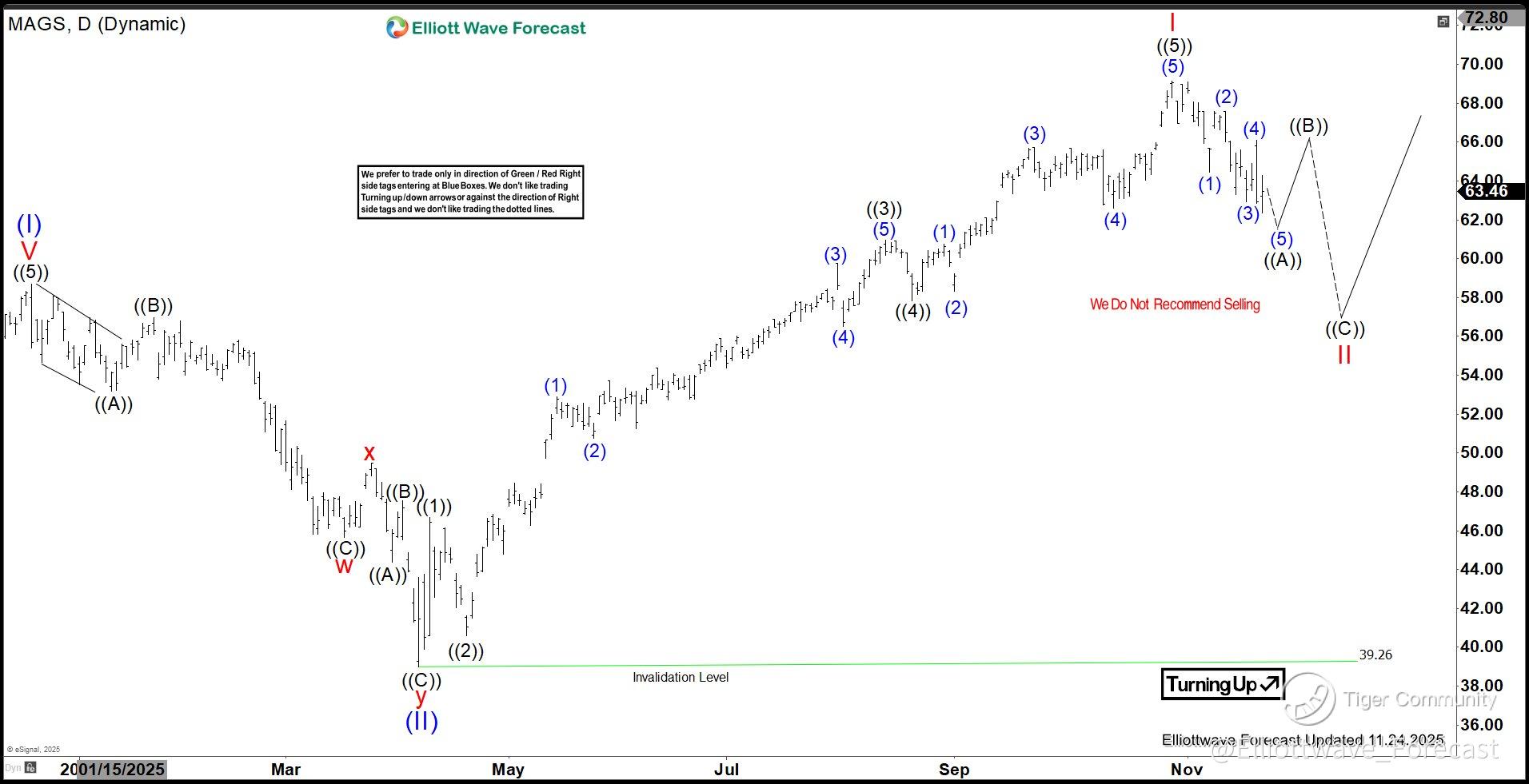 The Magnificent Seven ETF (MAGS) is the first fund designed to provide equal-weight exposure to the “Magnificent Seven” tech giants—Alphabet, Amazon, Apple, Meta, Microsoft, Nvidia, and Tesla. Launched in 2025, the ETF offers investors a focused way to capture the performance of these market-leading innovators that dominate the S&P 500 and drive much of its growth. Below we will update the Elliott Wave technical outlook for the ETF.