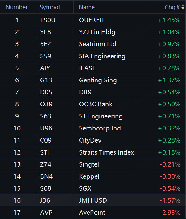Singapore stocks opened higher on Tuesday. STI rose 0.18%; OUEREIT, YZJ Fin Hldg, Seatrium up around 1%; SIA Engineering, iFast, DBS, OCBC Bank up within 1%; AvePoint down 3%.