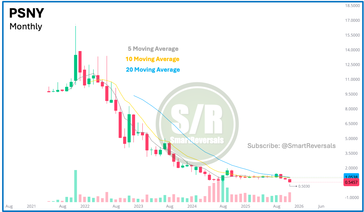 The electric vehicle euphoria was indeed a global phenomenon. After studying a Chinese and an American example, let’s conclude with a European one: Polestar Automotive Holding $Polestar Automotive(PSNY)$ . Adding moving averages to the chart immediately reveals the persistent downtrend. Crucially, the 20-month Moving Average has consistently acted as resistance, and the price is currently showing renewed signs of continuation lower.