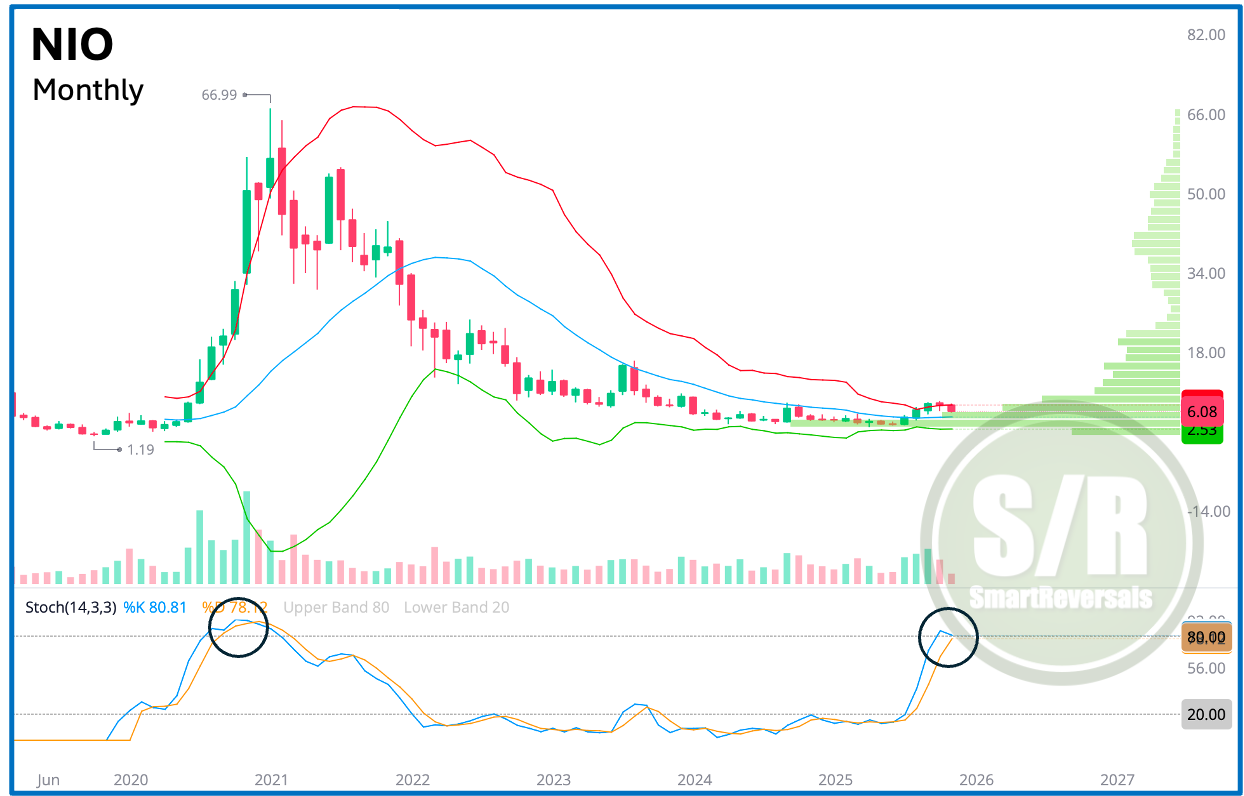 Let’s use NIO as a case study. The stock underwent a parabolic ascent, jumping 2,660% from $2.20 (April 2020) to $66.00 (January 2021) in just ten months. As the chart below shows, the Bollinger Bands (which highlight overbought (above the upper band) and oversold (below the lower band) conditions) were consistently breached. The price action on the monthly chart was completely above the upper band for several months, signaling an extremely rare overextension. This type of move typically results in a sharp snapback to the Bollinger range. Because the stock’s valuation lacked fundamental backing, the price collapsed just as the Stochastic Oscillator (a key timing indicator) printed a bearish crossover from the highly overbought zone (above 80).