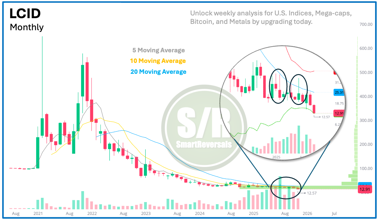 $Lucid Group Inc(LCID)$ offers yet another case study in EV stock euphoria. The stock embarked on a wild ride, first spiking 571% in five months, followed by a dramatic 75% crash over the next eight months. After a brief, powerful 261% rally, the price has failed to sustain any momentum and has trended relentlessly lower ever since. The stock now trades below its initial public offering price (IPO). Recent price action confirms this weakness, showing a clear rejection from the 20-month Moving Average as the downtrend accelerates.
