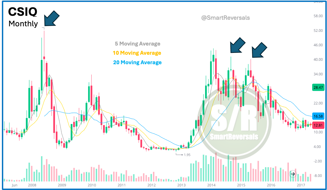 The collapse from $55 to $4 is a painful reminder of the risks involved in chasing euphoria. It validates the significance of the shooting star pattern mentioned above, as well as the critical role of moving averages as lines of defense. When one level is breached, the door opens to the next, as CSIQ illustrated in 2008 by rapidly surrendering the 5, 10, and 20 month averages. As highlighted, this exact pattern repeated in 2014 and 2015.