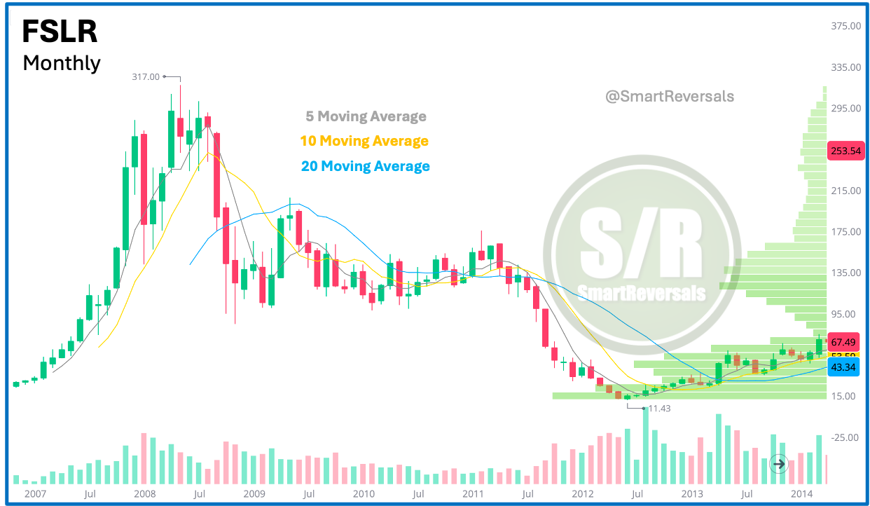 $First Solar(FSLR)$ is a name frequently traded today. The stock is currently attempting to form a bullish Cup-and-Handle pattern which, following a pullback (the handle), could target $377. The price must successfully surpass $281. However, let’s analyze the pullback that followed its 2008 peak of $317, which was set by an indecisive monthly candle. When FSLR lost the 5-month Moving Average (a major warning sign for any bullish security), the stock plummeted -73% in seven months, a decline accelerated by the Global Financial Crisis. Critically, while the S&P 500 bounced in March 2009, FSLR continued to fall, resulting in a total selloff of -96% from its all-time high. When you buy a specific asset that has been rallying in a parabolic fashion you must do three things: