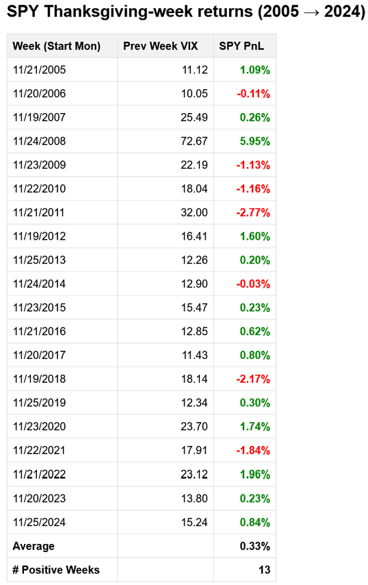 Historically, when the previous week’s $Cboe Volatility Index(VIX)$ closes in the 20s, the setup actually leans bullish for Thanksgiving week.