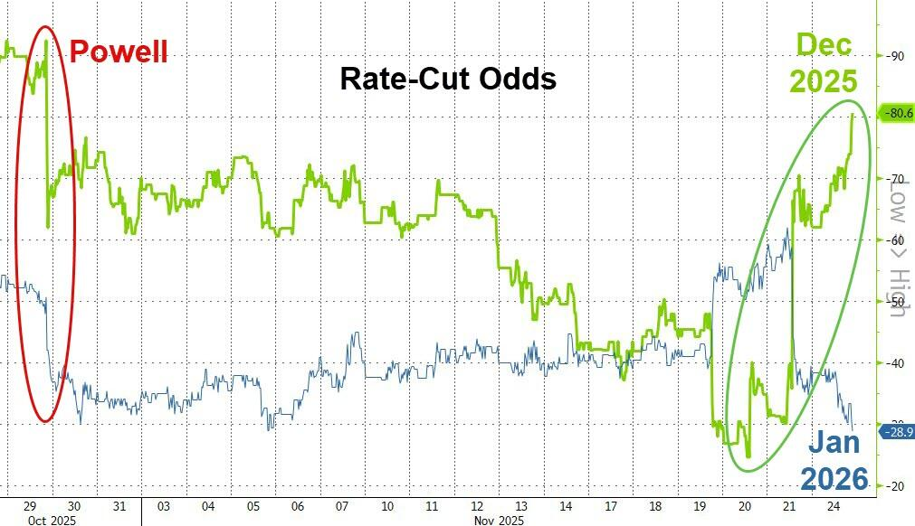 After last week’s steep sell-off, U.S. equities staged a rapid sentiment reversal within just a few days. For two consecutive trading sessions, Federal Reserve officials boosted expectations for a December rate cut, sending the probability surging to 80%. Tech stocks rebounded sharply, with $NASDAQ(.IXIC)$ posting its best single-day gain since May. Crypto also rallied to 87,793.