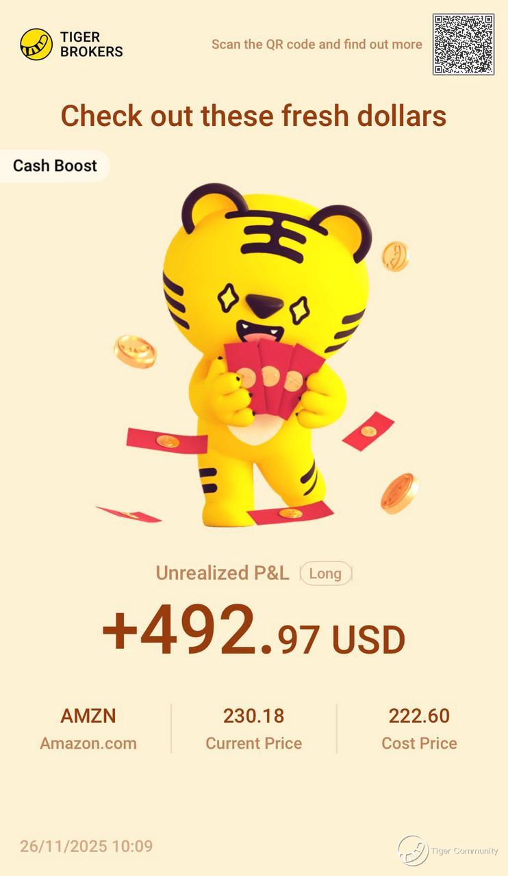 $Amazon.com(AMZN)$ 's $50B bet on AWS AI infrastructure is a game-changer! Known for its steady approach, AMZN is built to not just survive but thrive through the AI cycle. Took some profits and stayed bullish! Gotta love the contra688 promo too - that $688 trading boost for newbies is straight fire!