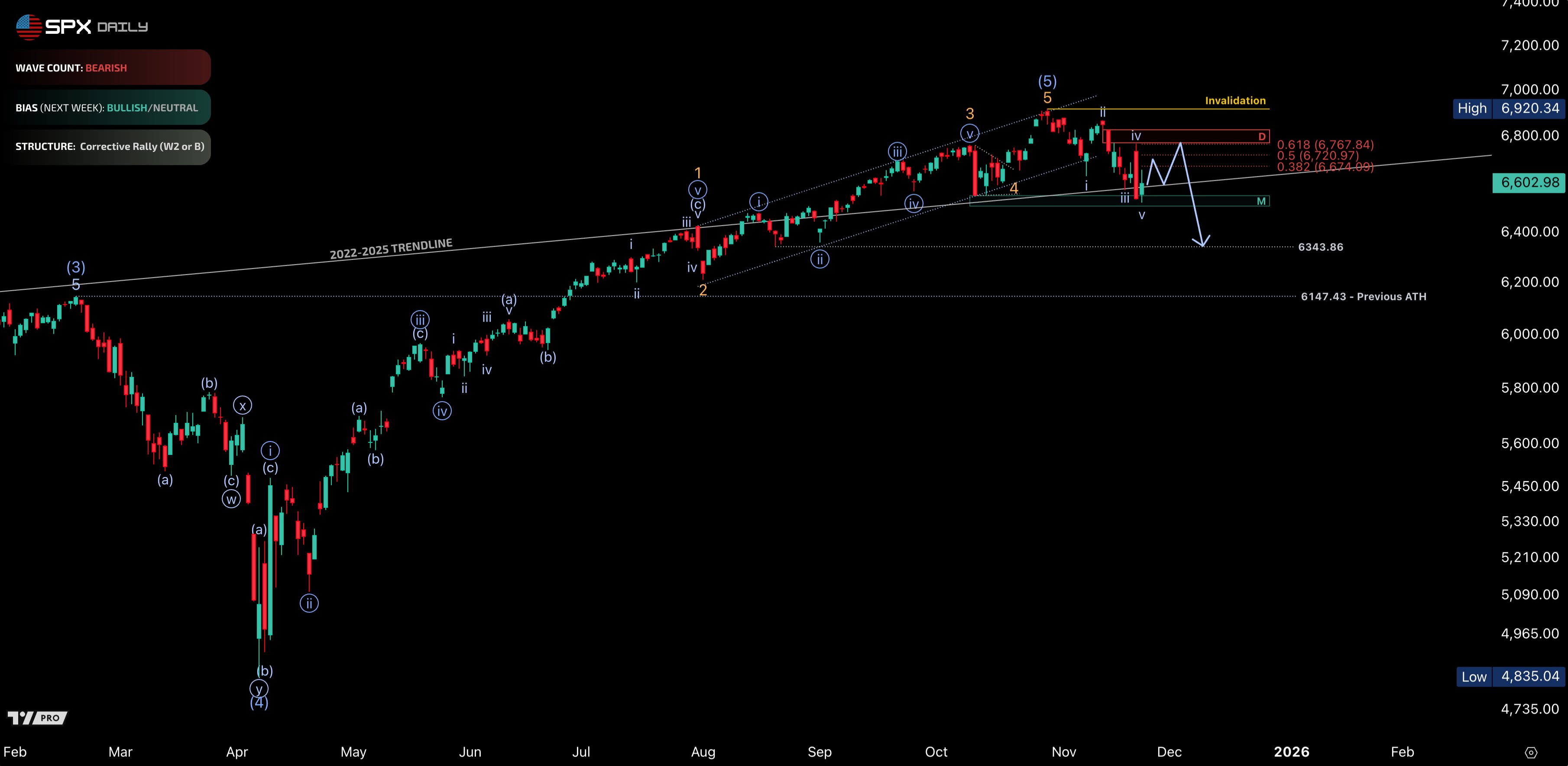 $S&P 500(.SPX)$ just reached the major resistance cluster at the Daily FVG and 61.8–78.6% retrace zone - this zone is where the Wave 2/B-Wave rally likely completes.