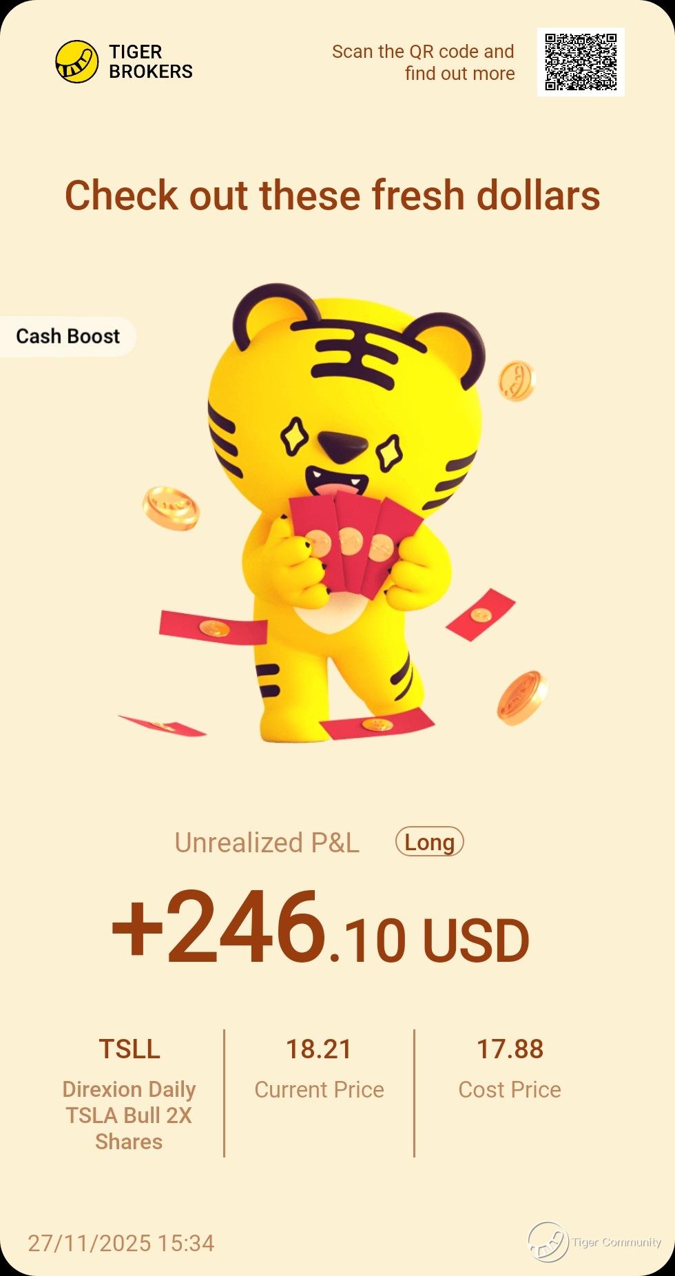 $Direxion Daily TSLA Bull 2X Shares(TSLL)$ ’s leveraged play on Tesla $Tesla Motors(TSLA)$ ’s rebound delivered—booked a small gain. My first trade hit the Contra 688 promo, and the SGD688 voucher landed instantly. Autonomous driving progress remains promising—I’ll buy dips again.