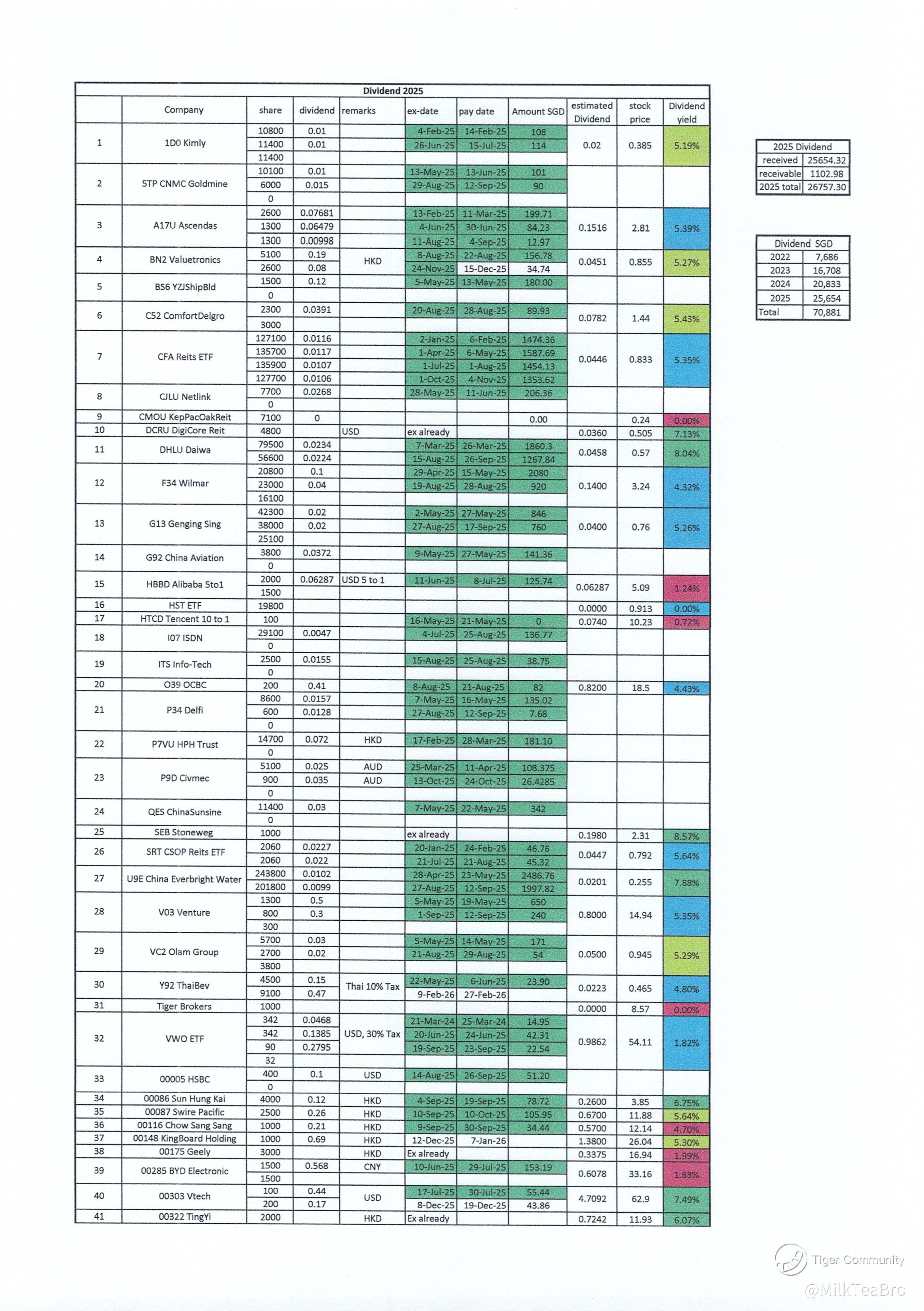 Dividends: Accumulated SGD 26,000 in dividends year-to-date, with SGD 25,000 already received.