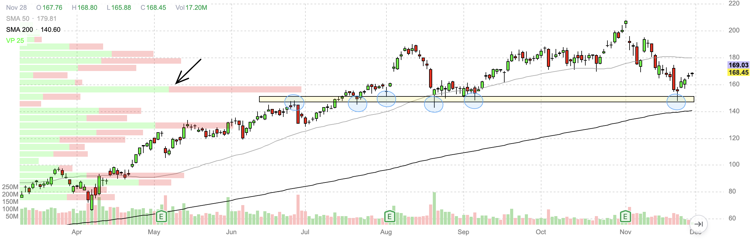 If I'm looking at the chart, I say..okay price rejected $150 in late June, resulting in a big red reversal candle.