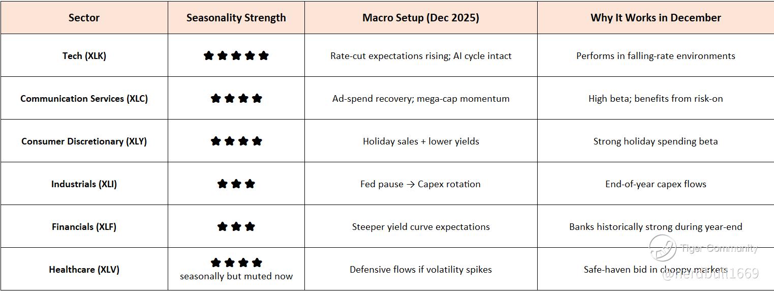 Healthcare (XLV) & Utilities (XLU): These were the defensive winners in November and remain strong historically in December as investors seek safety before year-end book closing.