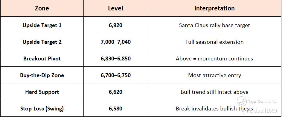 December historically offers one of the strongest edges; flows (rebalancing + seasonals) are supportive unless the index breaks major trend support.