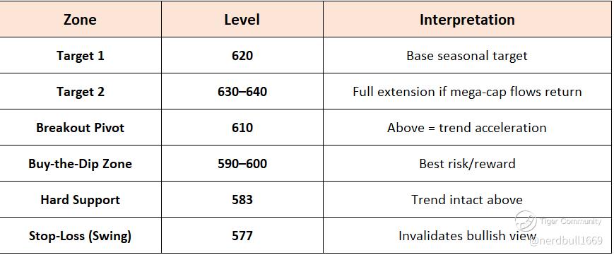 Buy QQQ 615/635 call spread (Jan expiration) Cheap due to seasonal IV compression and mega-cap flow dynamics.