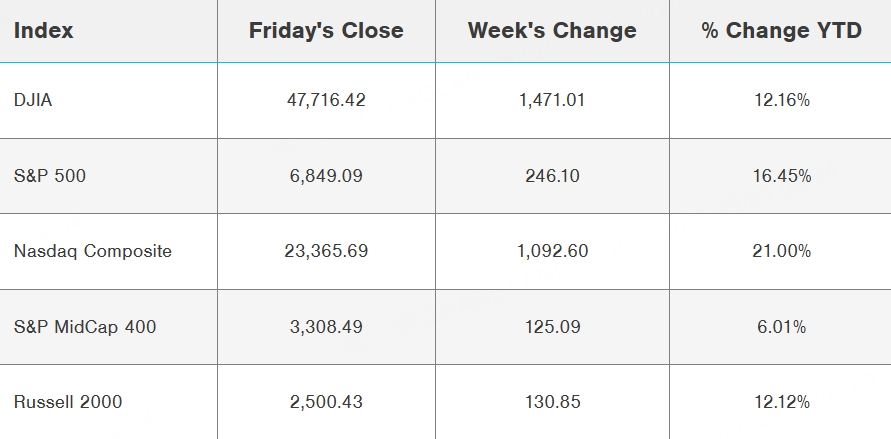 U.S. stocks ended the holiday-shortened week higher, supported by dovish Fed remarks and soft economic data that strengthened expectations for a December rate cut. Small-caps led gains, with the Russell 2000 up 5.52%. The Nasdaq also rebounded as AI optimism offset valuation concerns. Markets were closed Thursday for Thanksgiving.