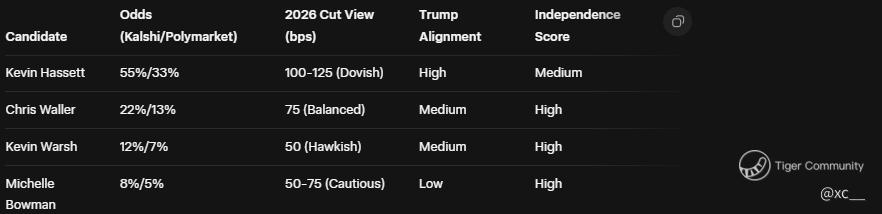 Hassett's the market's mad crush at 55% odds β Trump's NEC whisperer who's pushed "proactive" trims to juice growth, eyeing 100bps+ slashes in 2026 to counter tariff drags and keep GDP humming at 2.5%. His Tax Cuts playbook screams alignment: Lower rates offset 0.5% GDP hits from trade walls, supercharging AI capex to $3T without inflation Armageddon. Waller (22%)? The continuity king β his recent dissents for cuts signal steady 75bps easing, data-driven without drama, defending independence like Powell's playbook. Warsh (12%)? The hawk hybrid β shrink the balance sheet first, then trim, tolerating brief spikes for long-term stability, but his crisis cred could pause if tariffs ignite. Polymarket's cooler at 33% for Hassett, but all three lean dovish vs Powell's caution β a chair swap cracks the door wider for 2026 cuts, especially if Trump loyalty loosens the Fed's reins. Prediction markets scream 80% for at least two trims, but hot PCE Friday (est 2.3% core) could yank to 60%. Who's the wild card? Hassett's Trump tilt β bullish for cuts, bearish for dollar at 94 forecasts. π¦π²