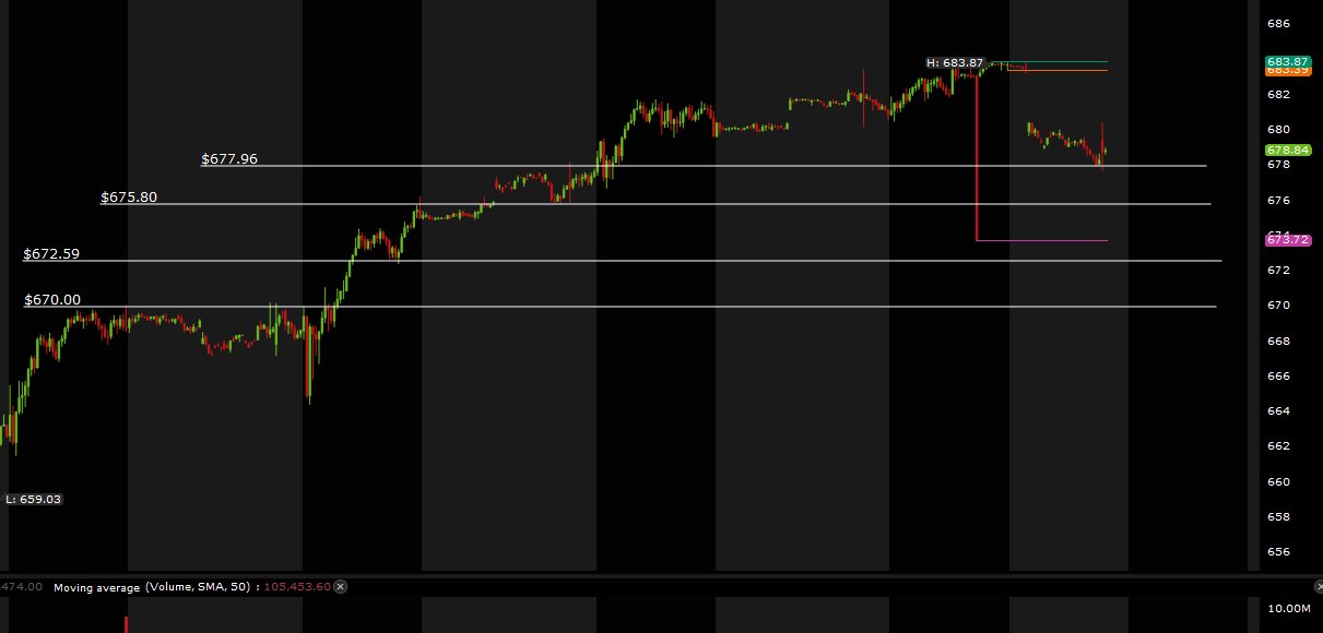 SPY key levels of support are at $678 and $675. If we fail that there big demand zone from $670-$672.50 (see chart below).