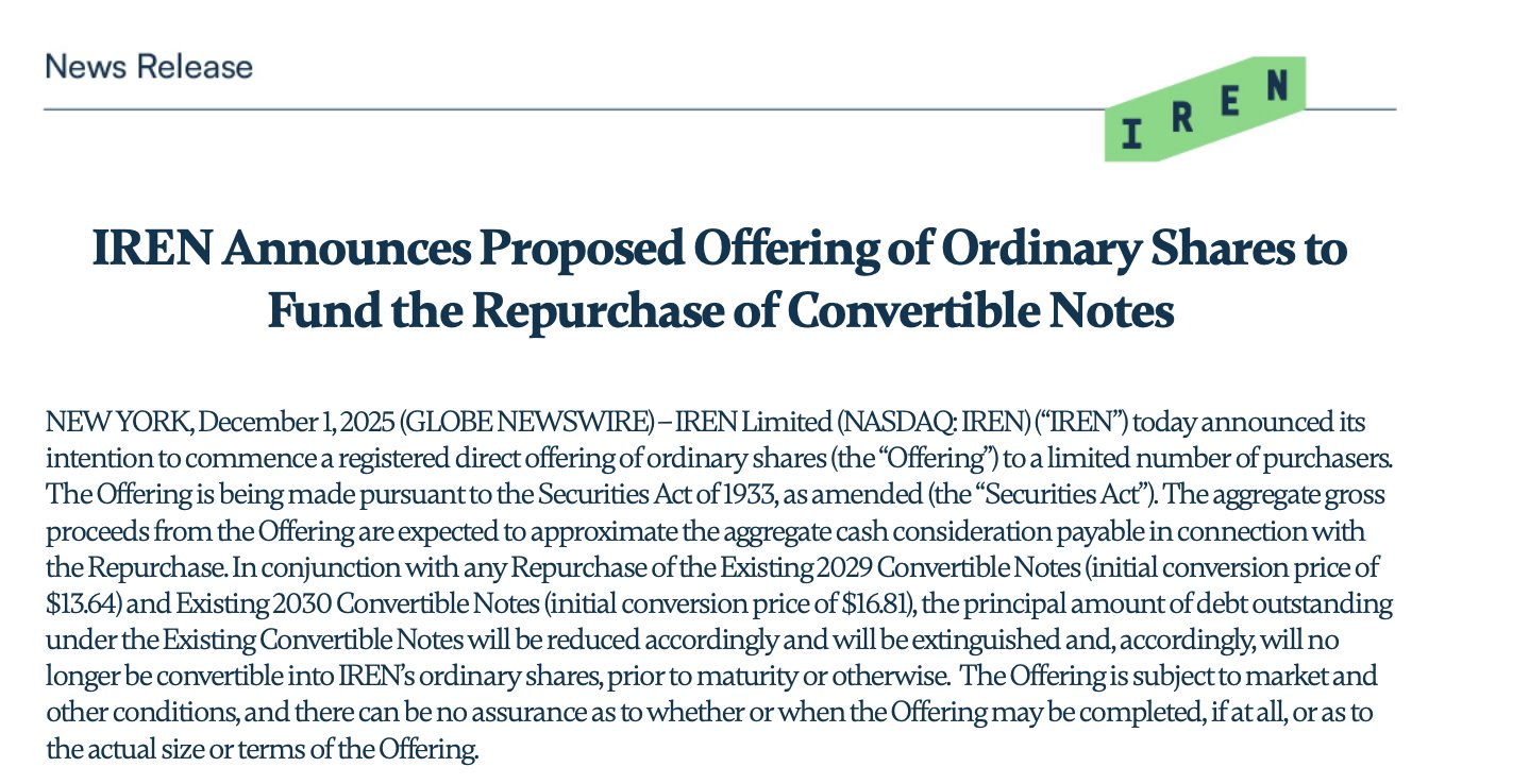 Why is $IREN Ltd(IREN)$ selling shares and diluting shareholders now, instead of letting notes convert in 2029/30?