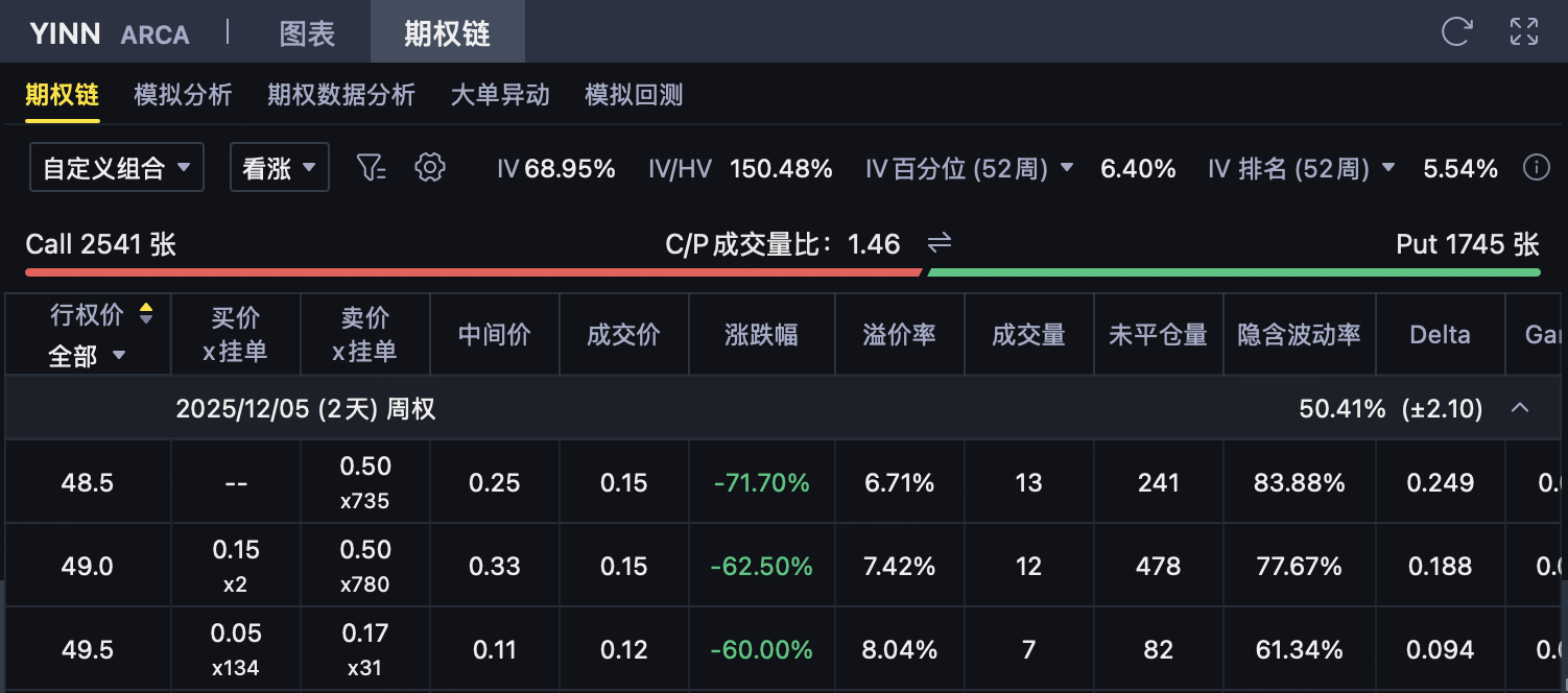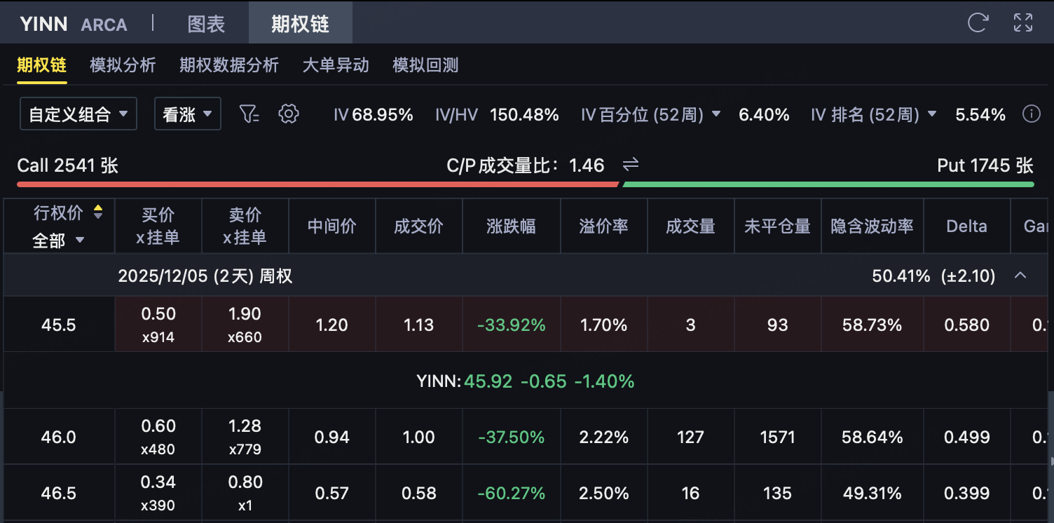 Applicable scenario: Investors expect YINN to trade sideways or fall slightly before expiration, and will not break the pressure range near $46.48