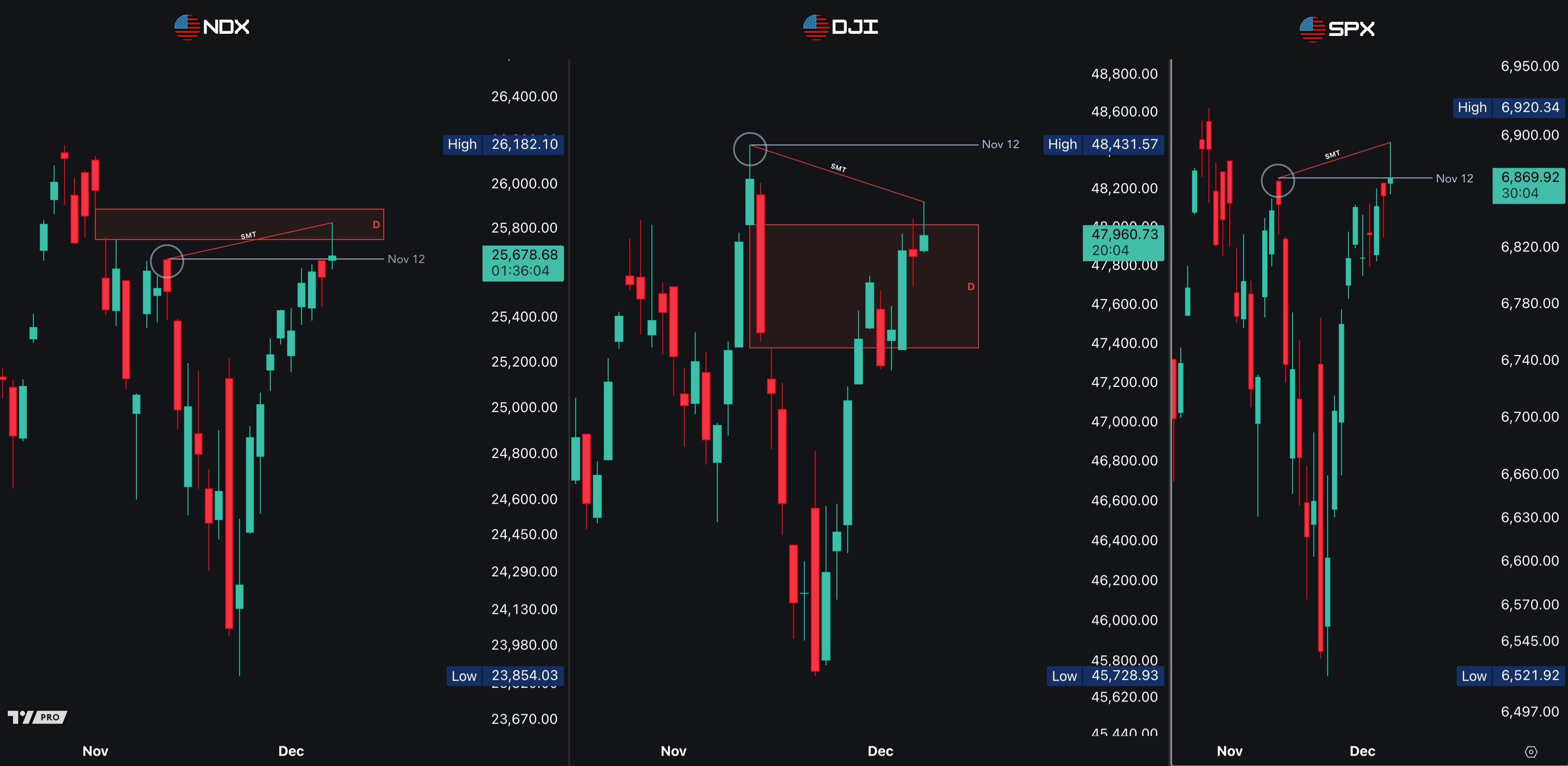 At the same time, both NDX and DJI are rejecting from Daily FVG resistance, adding confluence for a potential reversal.