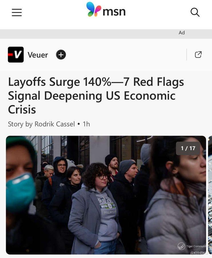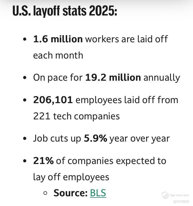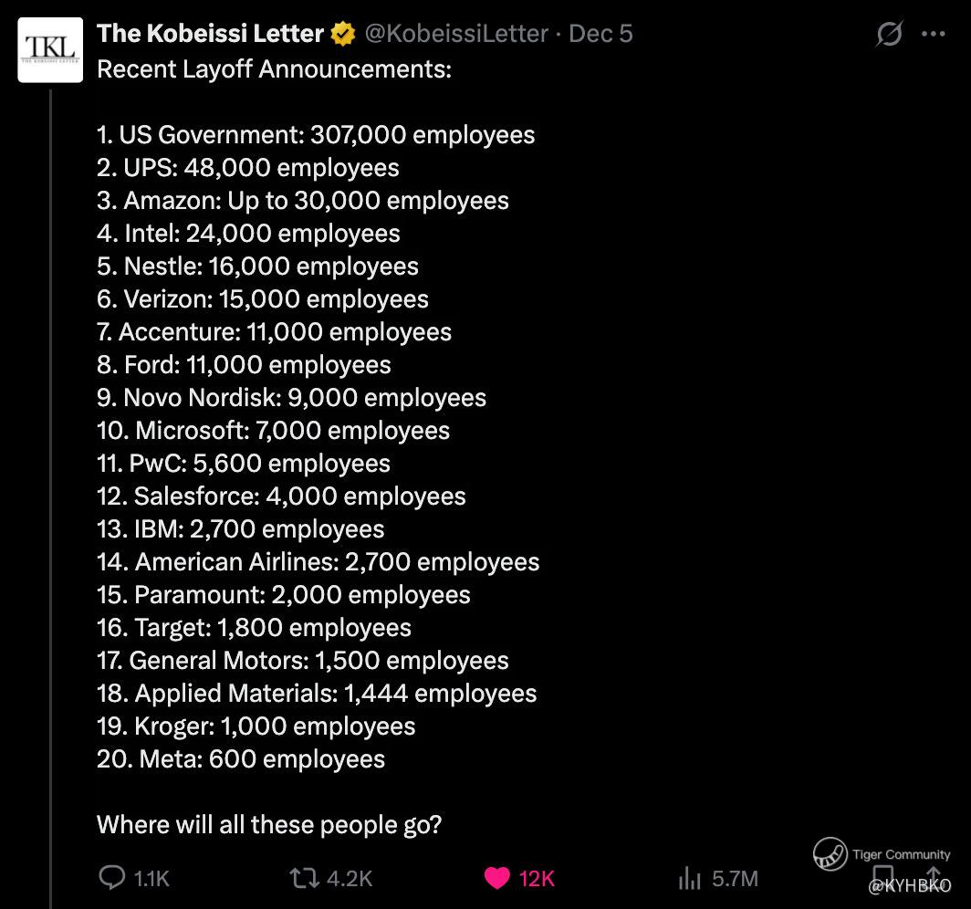 U.S. layoffs totaled 71,321 in November and reached 1.17 million this year. It’s the most since 2020, and a 44% increase from 2024. Recent Layoff Announcements: UPS: 48,000 employees; Amazon: Up to 30,000 employees; Intel: 24,000 employees; Microsoft: 15,000 employees. 2026 will be the year of mass unemployment.