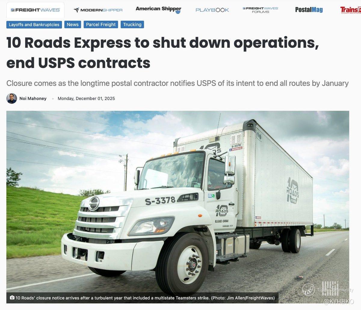 10 Roads, one of the largest postal linehaul operators, shutters. The fleet had 2500 trucks and 2600 drivers. This shutdown is one of the largest trucking failures ever and the largest since Yellow filed bankruptcy in 2023. Nearly 5000 employees will be out of work.