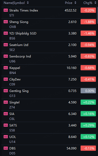 Singapore stocks opened lower on Monday. STI fell 0.2%; Sheng Siong fell 2%; Yangzijiang Shipbuilding, Seatrium fell 1%.