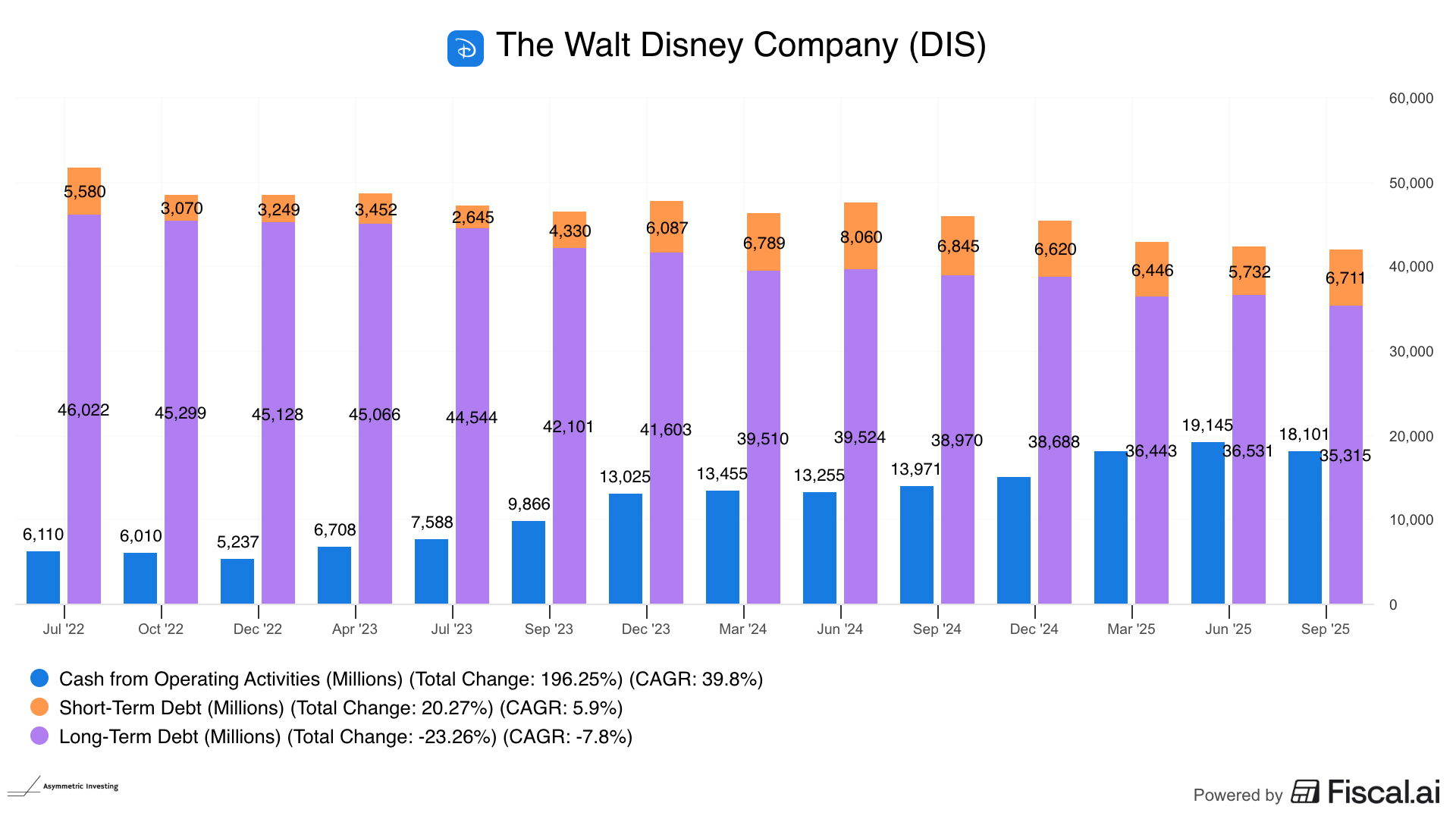 And Disney’s debt it falling as operating cash flow rises. That gives the company flexibility to invest in parks (which it’s doing), sports content, and customer acquisition.