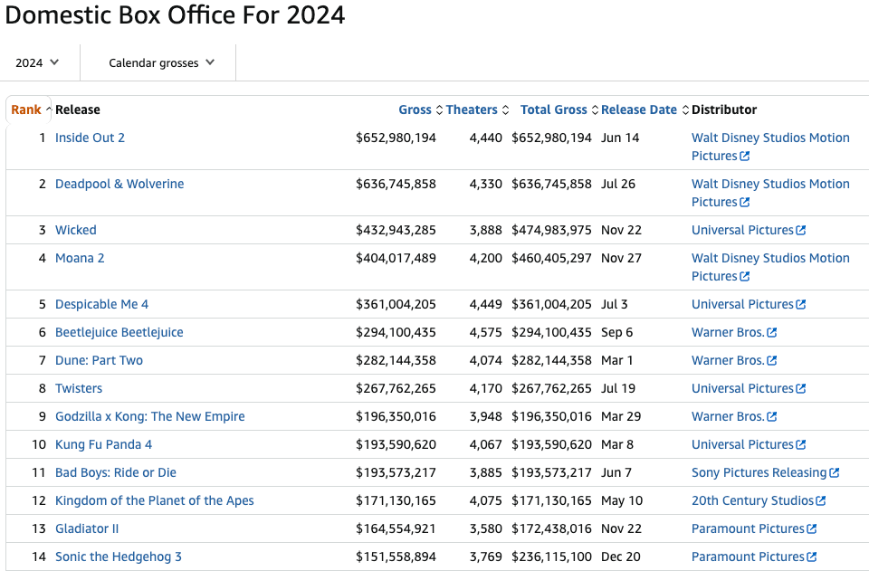 Last year was an even better year for Disney+ content, with Inside Out 2 and Moana 2 in the top four.