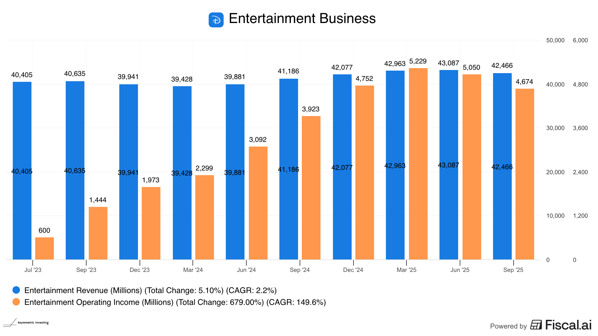And entertainment has been heading in the right direction as streaming becomes operating income positive and studios start to kick out hits.