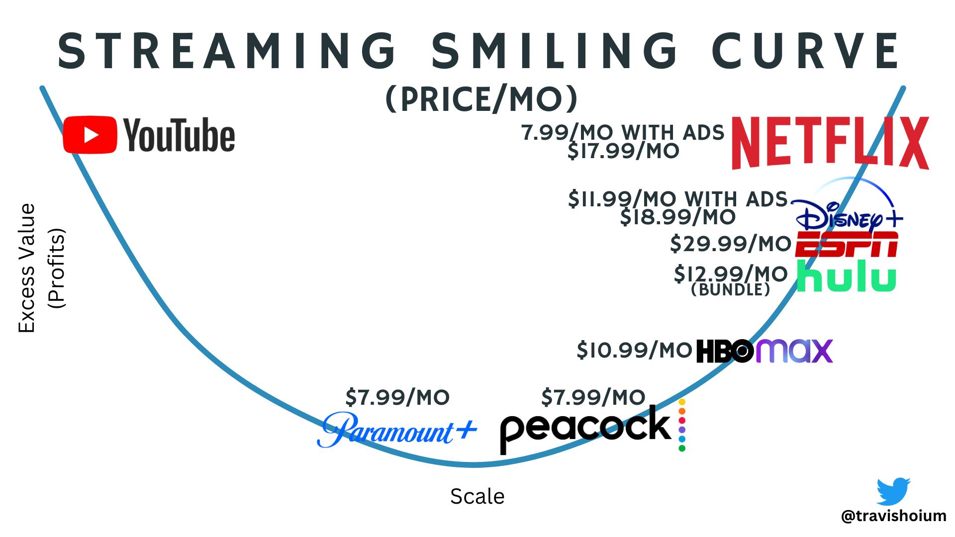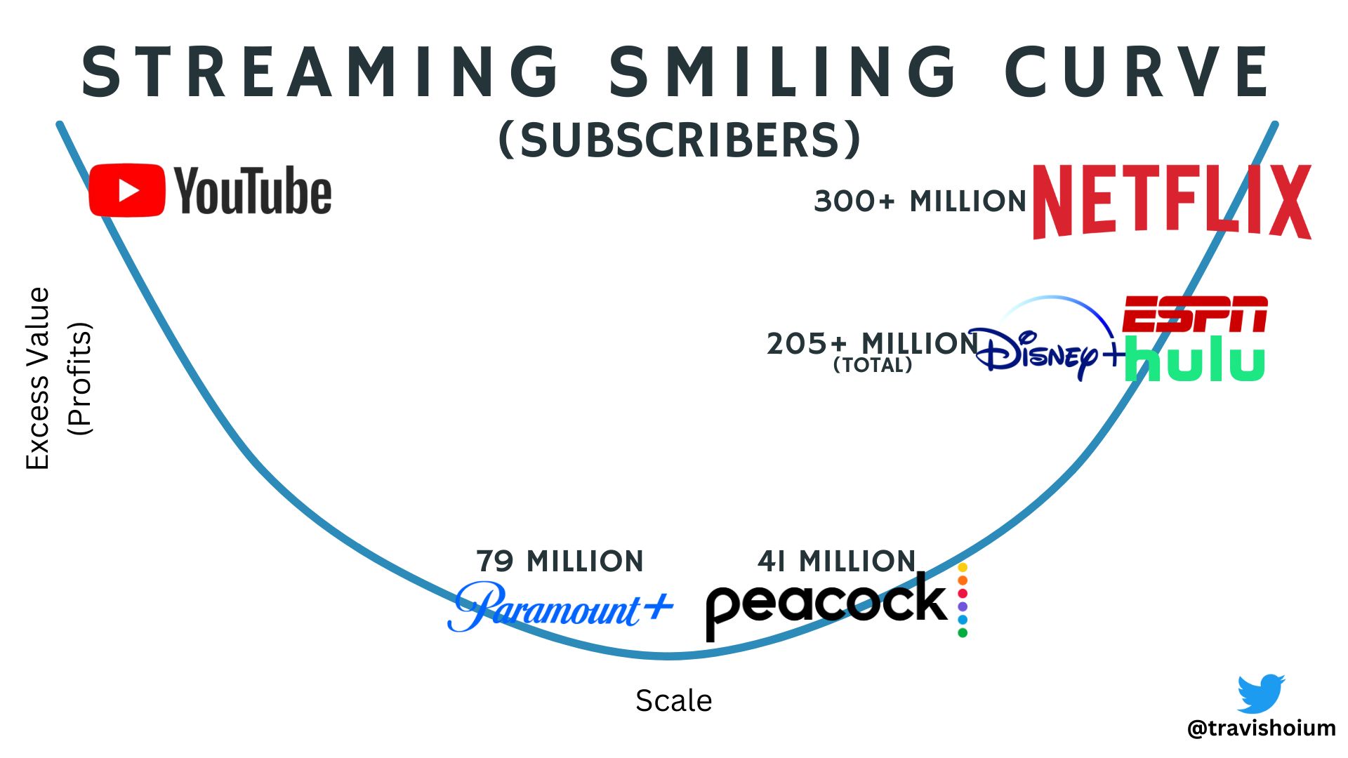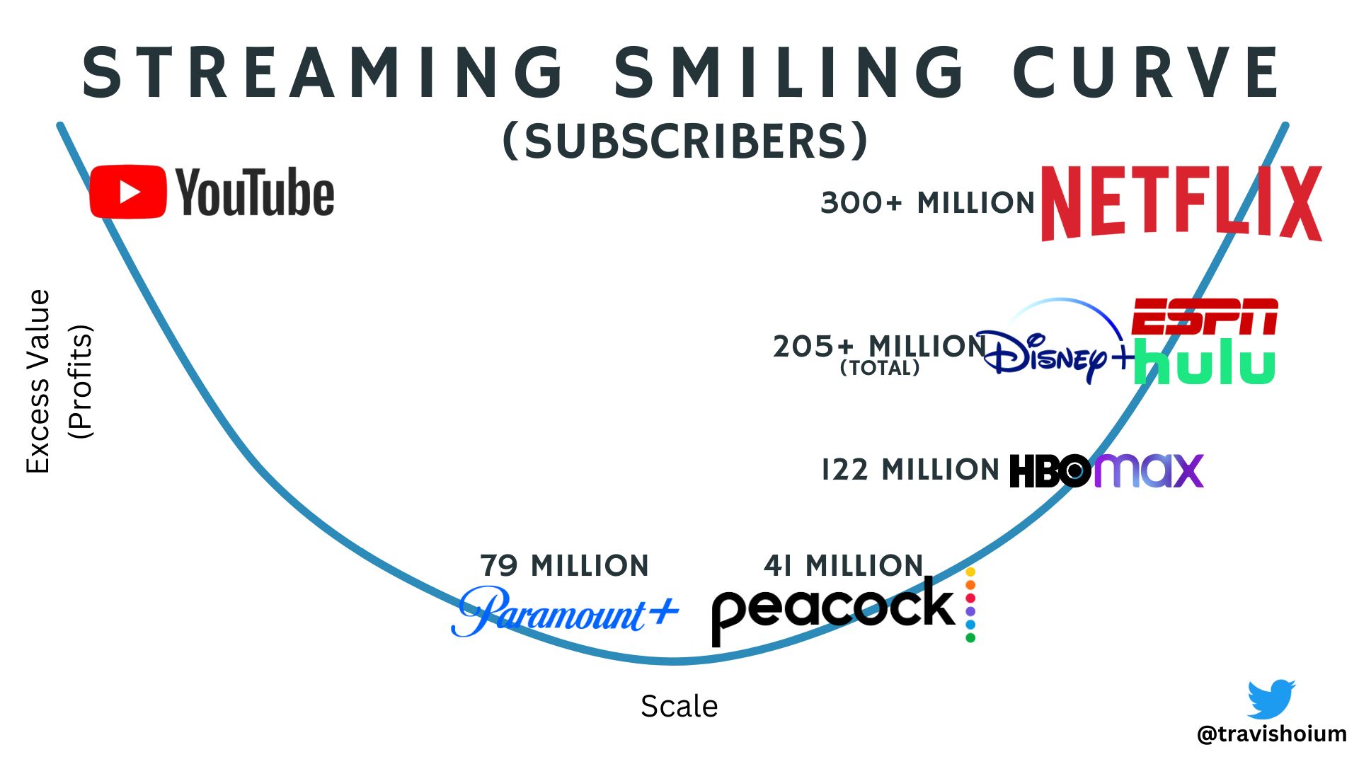 The subscriber numbers tell part of the story, but the reason the smiling curve is so instructive is that it shows not only the companies with the most users/subscribers, but also how that user base translates to better content and ultimately higher prices and exponentially higher revenue overall.