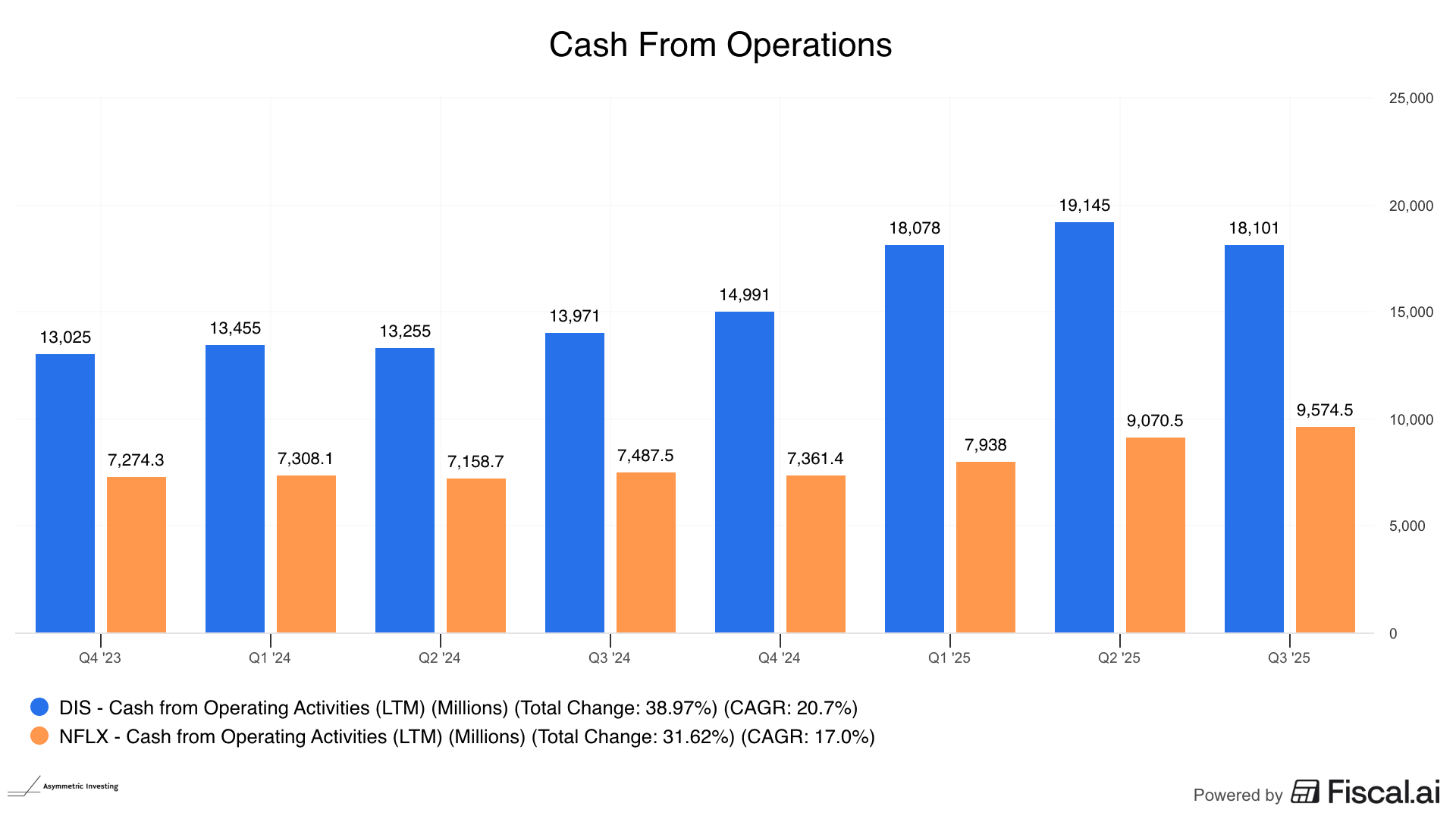At 15x earnings and 19x free cash flow, Disney is a steal compared to Netflix’s 42x earnings and 51x free cash flow multiple.