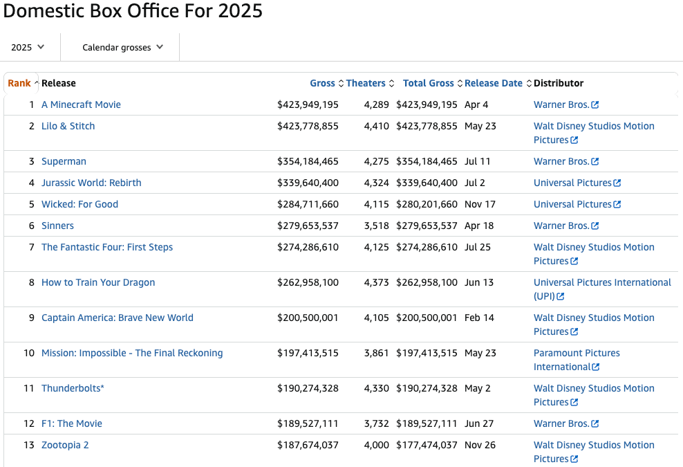 The kids/family content extends to the box office, too. WBD had a hit with Minecraft, but you can see that Lilo & Stitch, How to Train Your Dragon, and Zootopia 2 will all end up in the Top 10 movies of the year, and they’ll all be on Disney+.