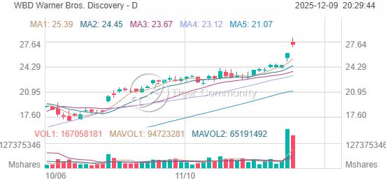 WBD closed at $27.23 on December 9, 2025 EST, gaining +4.41% (+$1.15) from previous session. The stock achieved a new 52-week high of $28.16, representing a remarkable 274% recovery from its 52-week low of $7.52.