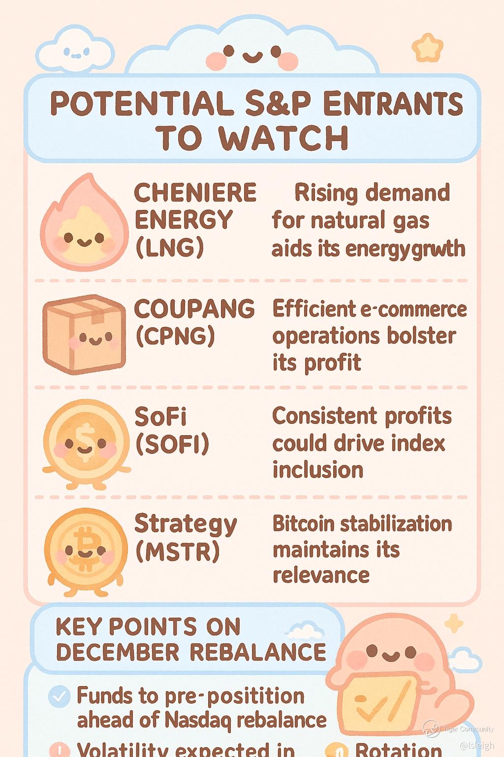 Cheniere stands out as the strongest energy candidate. Rising global demand for natural gas, combined with new US export infrastructure, positions LNG as a strategic asset. If geopolitical tensions remain elevated and Europe maintains its diversification away from Russian supply, Cheniere could be pushed into the index sooner rather than later. Expect accumulation by passive funds if crude stabilises above eighty and winter demand remains strong.