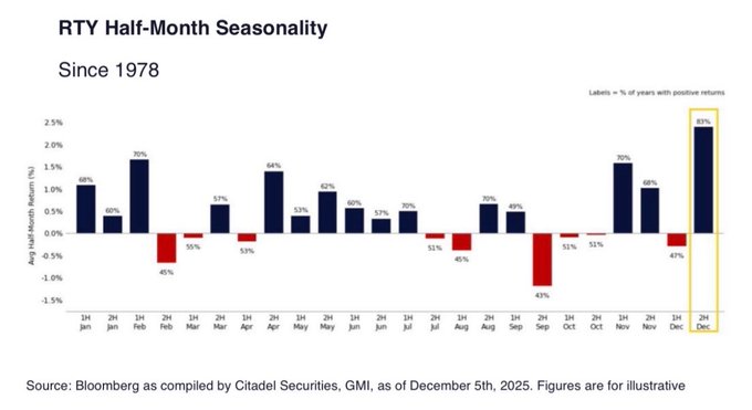 The 2nd half of December is the most bullish 2wk period of the year for the $E-mini Russell 2000 - main 2512(RTYmain)$ dating back to 1978.