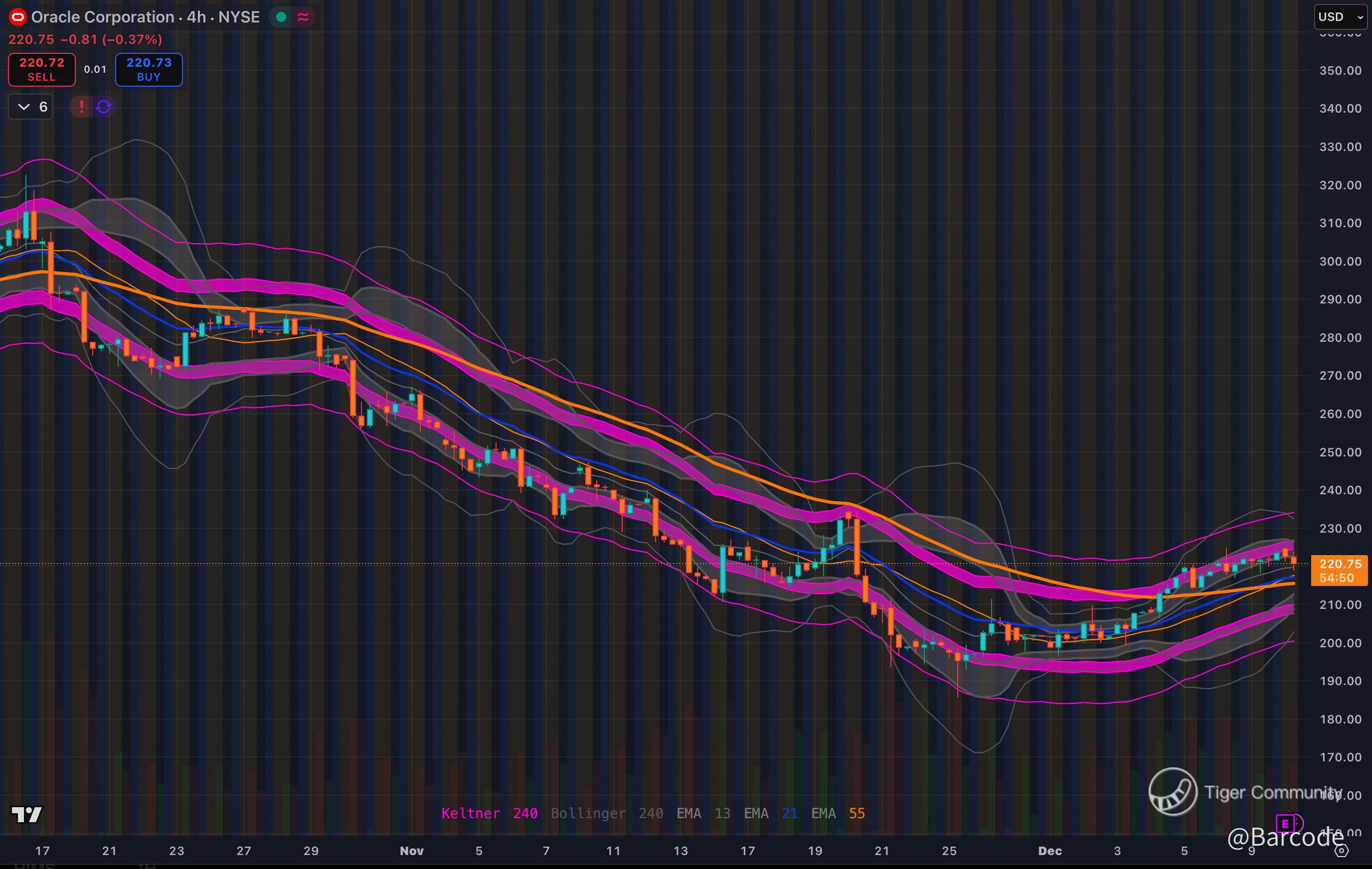 The 4H Keltner and Bollinger charts show price breaking above the long downtrend channel that dragged $ORCL from $330 to $190.